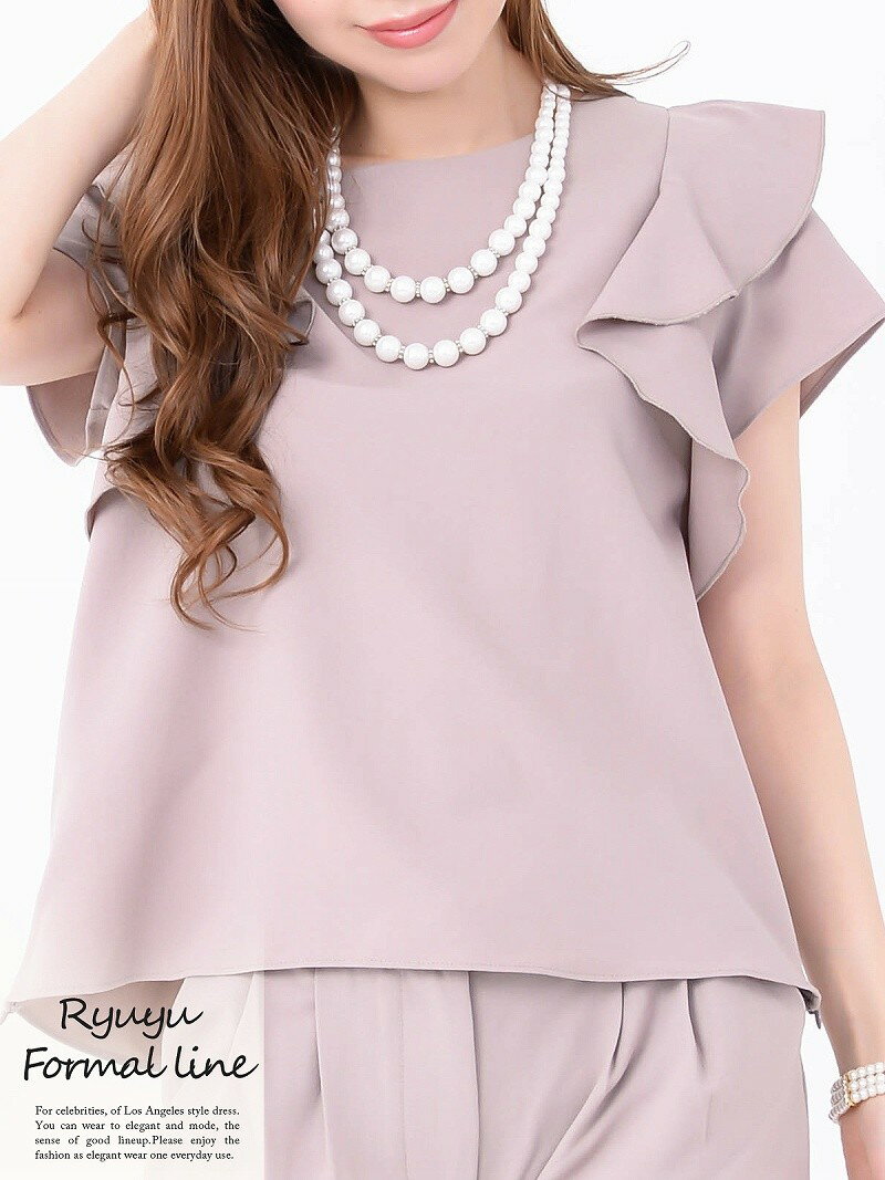 贅沢に施されたフリルスリーブで気になる二の腕も上品にカバーしてくれる大人2pパンツドレス♪