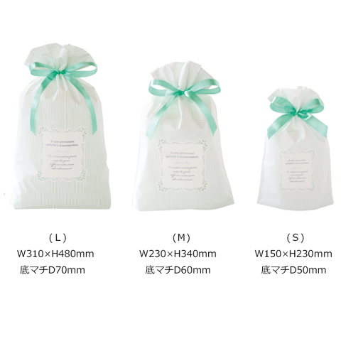 商品説明商品名ミントストライプ リボン付PEギフトバッグサイズ(L)1枚:W310×H480×底マチD70mm〔厚み〕0.06mm(M)2枚:W230×H340×底マチD60mm〔厚み〕0.06mm(S)3枚:W150×H230×底マチD50mm〔厚み〕0.06mm 素材塩素化ポリエチレン(ソフト) 仕様サテンリボン付 ご注意事項 ※袋のサイズ(縦・横・底マチ)及びマチ有り/マチ無し、をご確認・ご了承の上、ご注文下さい。